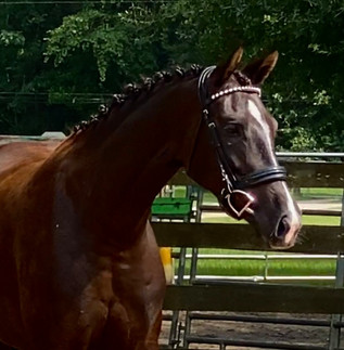 This mare is out of the gorgeous dam, Matera. Matera is by the highly successful dressage stallion Maronjo and out of a mare by Goldschlaeger. She is big, correct mare with substantial bone. Very feminine type, gorgeous head and neck, and well-balanced. She is a big, powerful mover with great push from behind. She has produced many very nice foals and is a great mother.