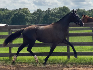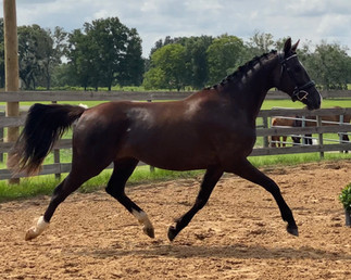 2019 GOV Oldenburg mare by Rodioso, out of a big Maronjo/Godlschlaeger mare. Elastic mover with natural suspension and an elegant head and well defined neck. Three powerful gaits and very well balanced. Beautiful type and well developed for her age. As sweet as they come, mellow disposition and easy to work with. Will mature to 16.2+ hh.